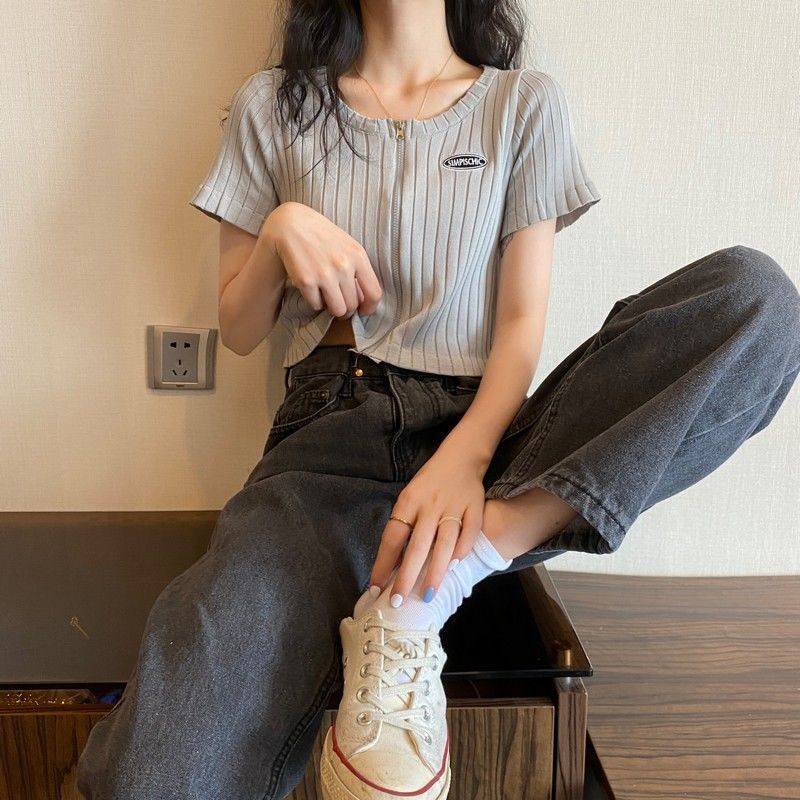 开衫夏季短款短袖针织黑色拉链2021年设计感露脐ins上衣女新款t恤热门设计联盟服务商
