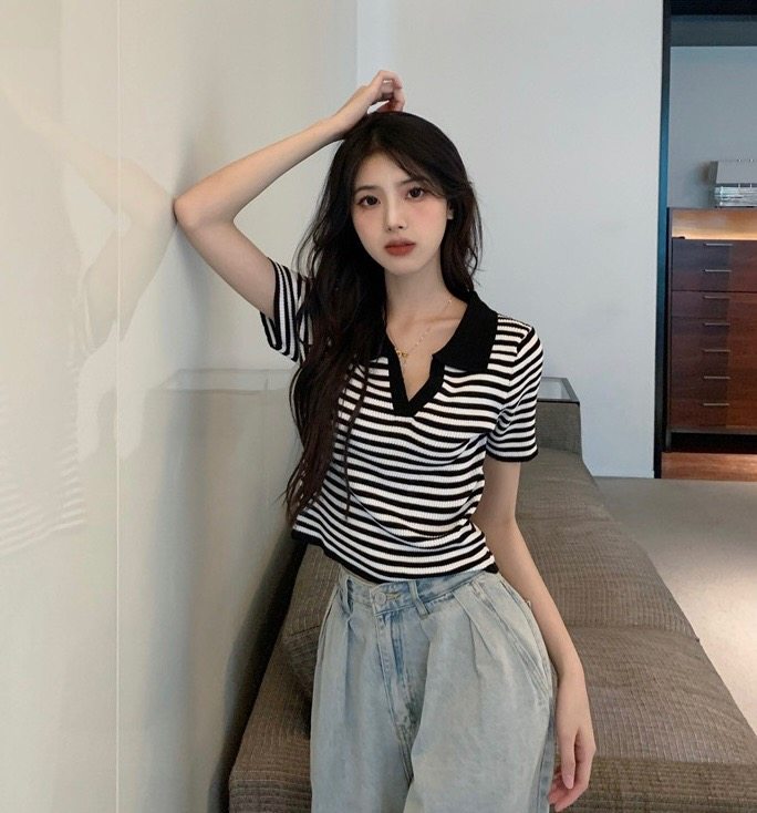 黑白条纹polo领T恤女2022年夏季新款设计感小众百搭显瘦短袖上衣热门设计联盟服务商
